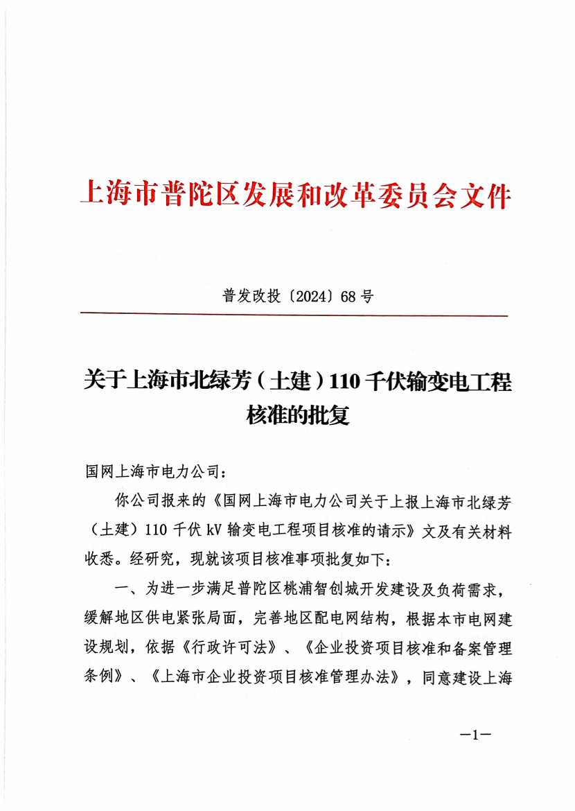 一、为进一步满足普陀区桃浦智创城开发建设及负荷需求,缓解地区供电紧张局面,完善地区配电网结构,根据本市电网建设规划,依据《行政许可法》、《企业投资项目核准和备案管理条例》、《上海市企业投资项目核准管理办法》,同意建设上海市北绿芳(土建)110千伏输变电工程。