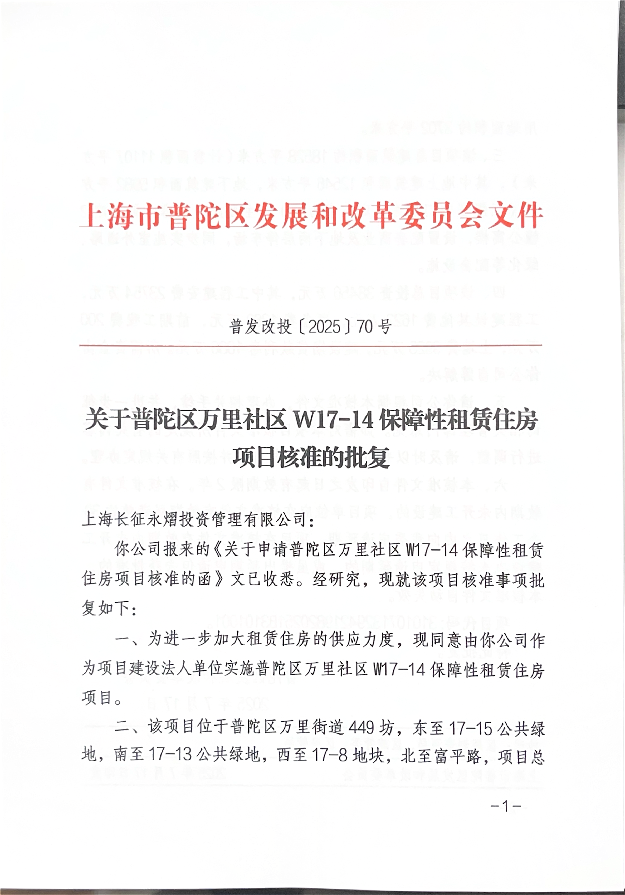 你公司报来的《关于申请普陀区万里社区W17-14保障性租赁住房项目核准的函》文已收悉。经研究,现就该项目核准事项批复如下: