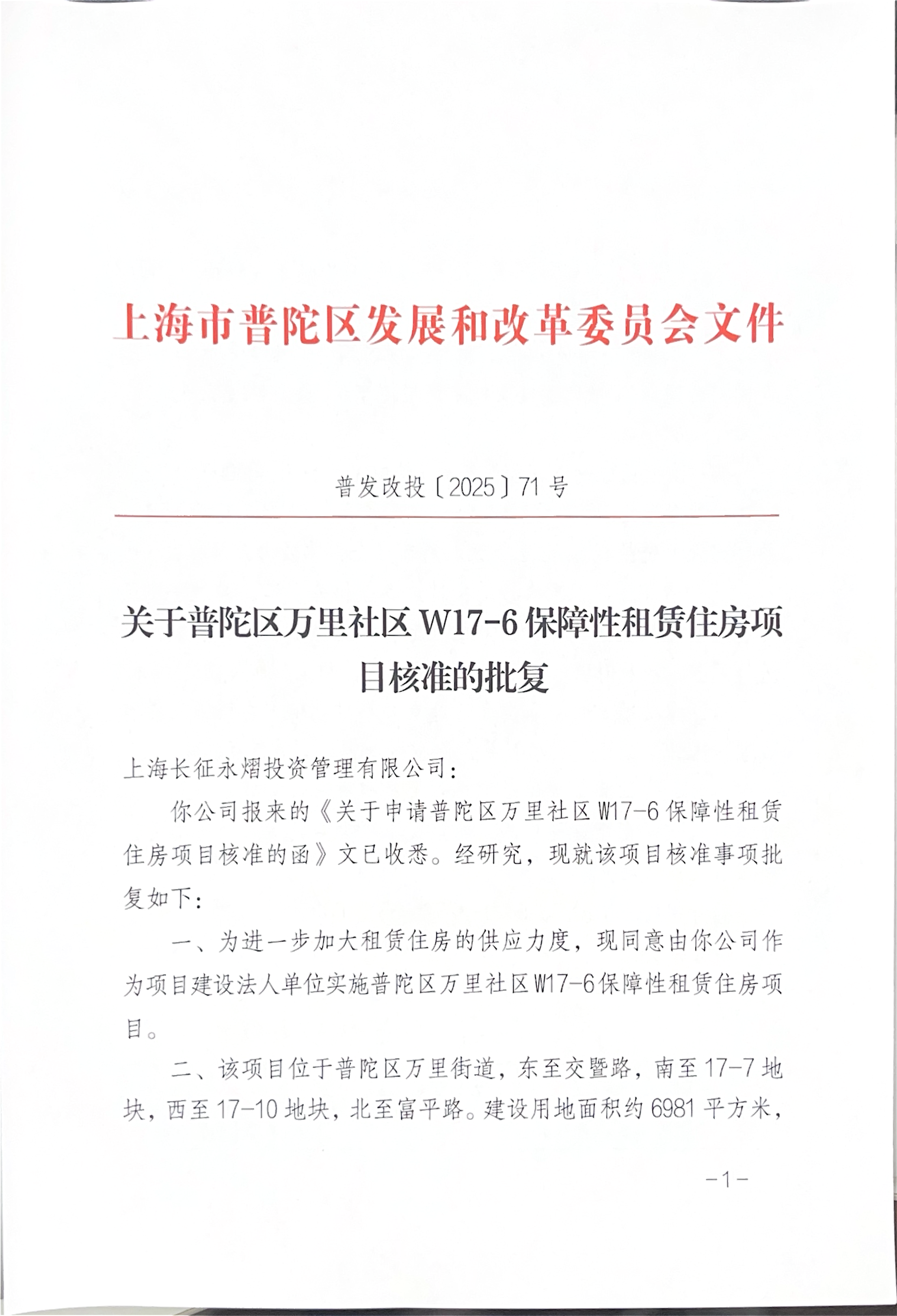 你公司报来的《关于申请普陀区万里社区W17-6保障性租赁住房项目核准的函》文已收悉。经研究,现就该项目核准事项批复如下:
