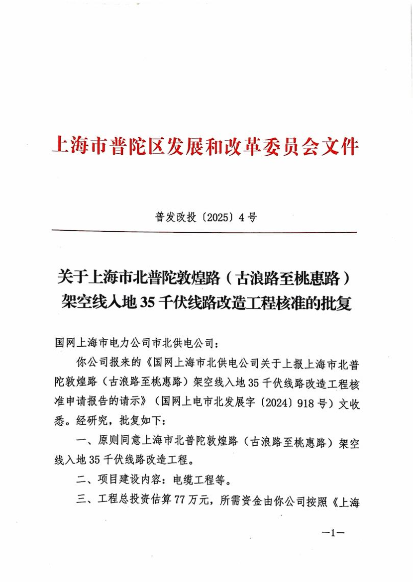 一、原则同意上海市北普陀敦煌路(古浪路至桃惠路)架空线入地35千伏线路改造工程。