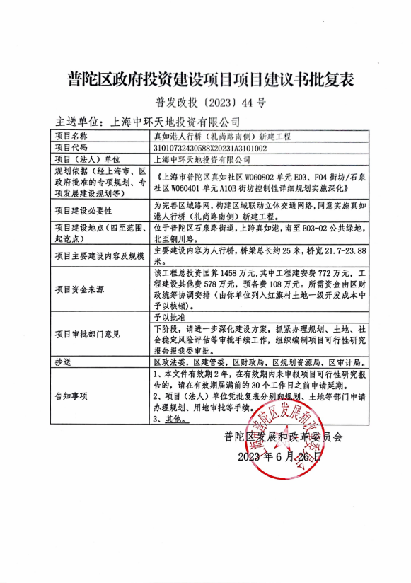 关于真如港人行桥(礼尚路南侧)新建工程项目建议书的批复