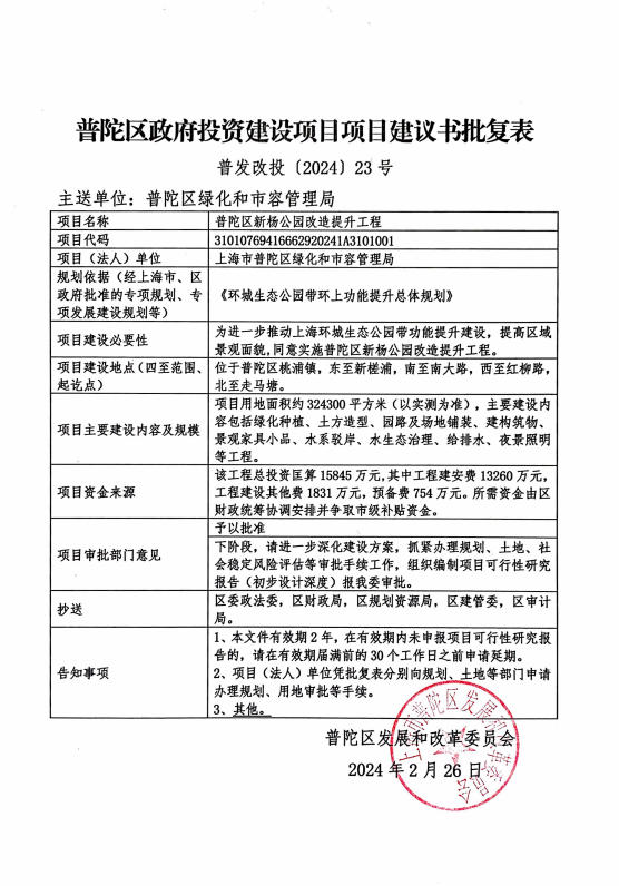 关于普陀区新杨公园改造提升工程项目建议书的批复