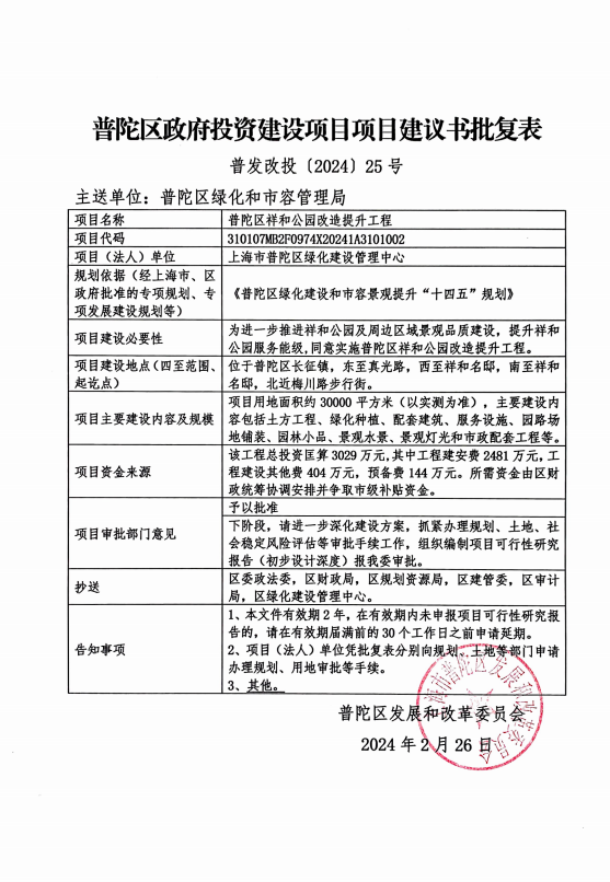 关于普陀区祥和公园改造提升工程项目建议书的批复