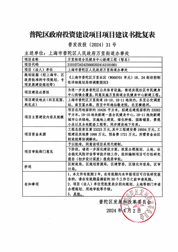 为进一步完善普陀区公共体育设施,推进实现社区市民健身中心街镇全覆盖,同意实施万里街道全民健身中心新建工程。 |