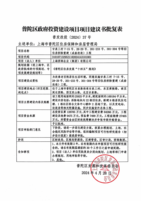 关于甘泉三村7-15号、28-29号、201-233号、301-304号等旧住房拆除重建(成套改造)工程项目建议书的批复