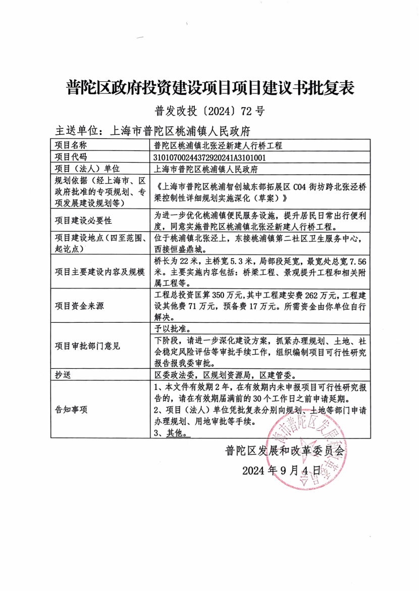 关于普陀区桃浦镇北张泾新建人行桥工程项目建议书的批复