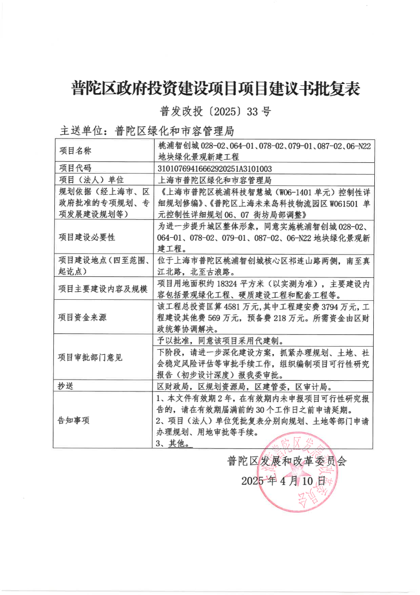 关于桃浦智创城028-02、064-01、078-02、079-01、087-02、06-N22地块绿化景观新建工程项目建议书的批复