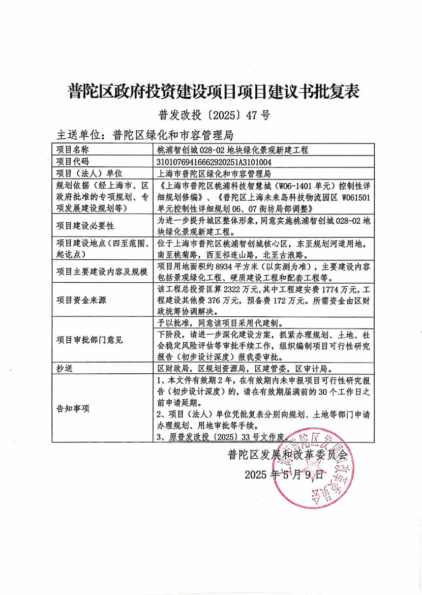 关于桃浦智创城028-02地块绿化景观新建工程项目建议书的批复
