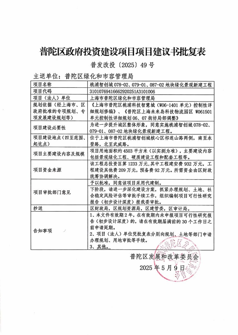 关于桃浦智创城078-02、079-01、087-02地块绿化景观新建工程项目建议书的批复