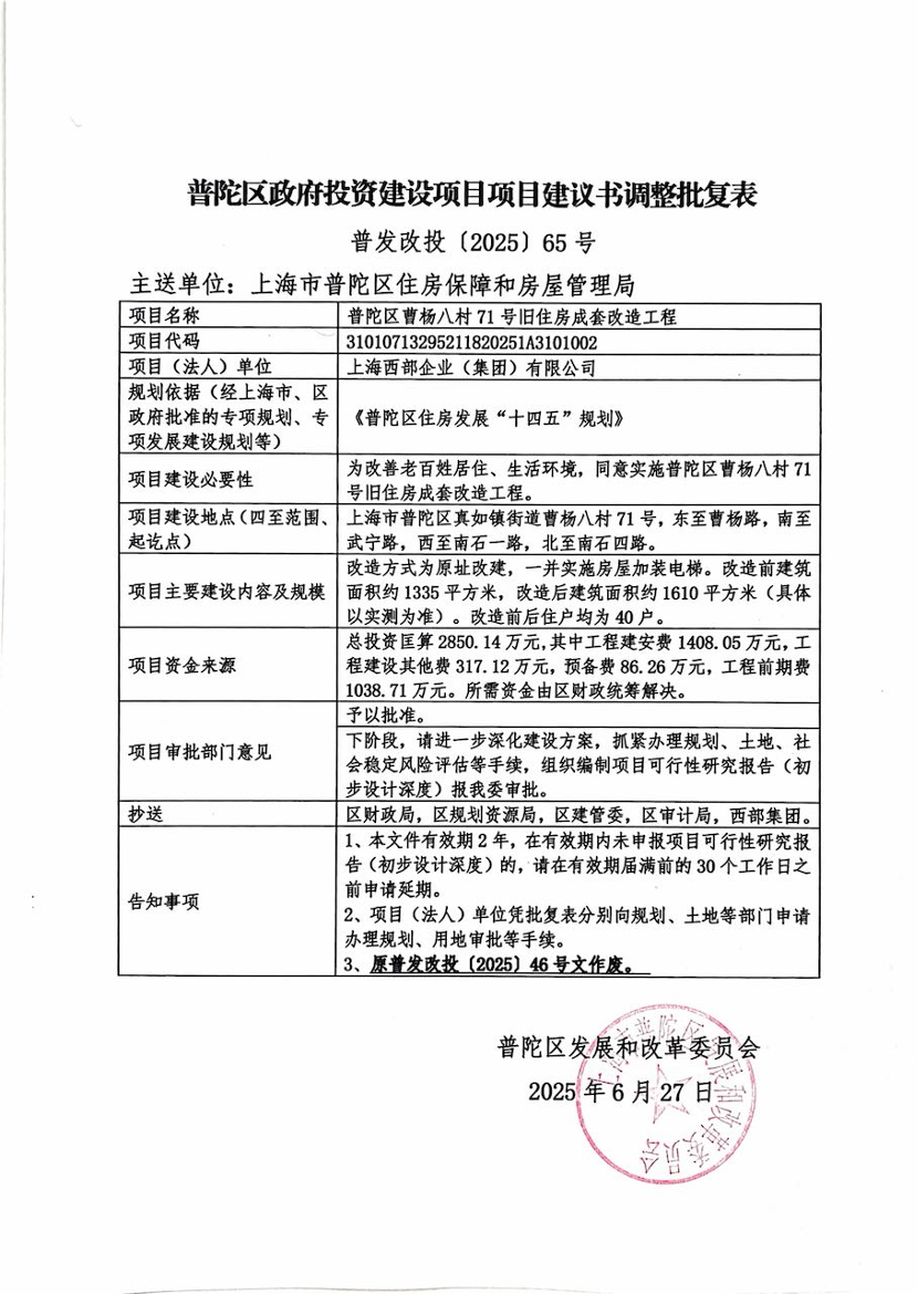 关于普陀区曹杨八村71号旧住房成套改造工程调整项目建议书的批复