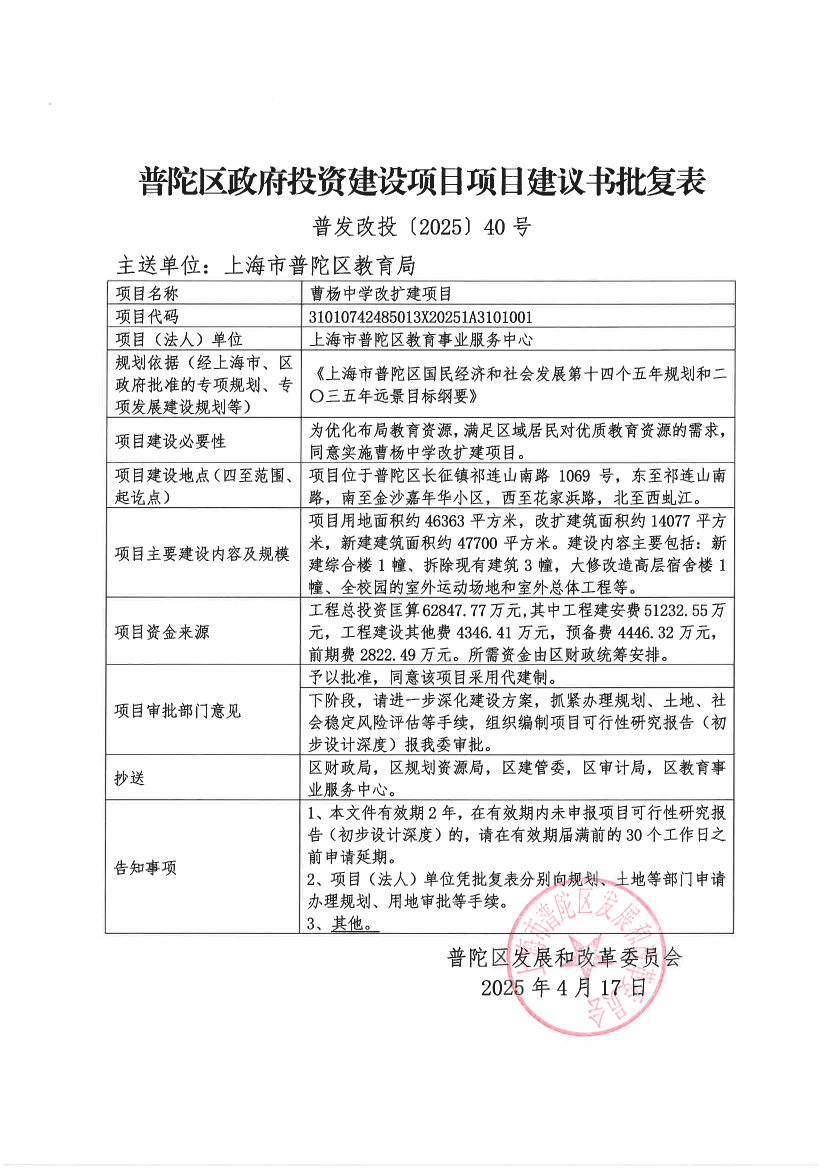 为优化布局教育资源,满足区域居民对优质教育资源的需求,同意实施曹杨中学改扩建项目。 |