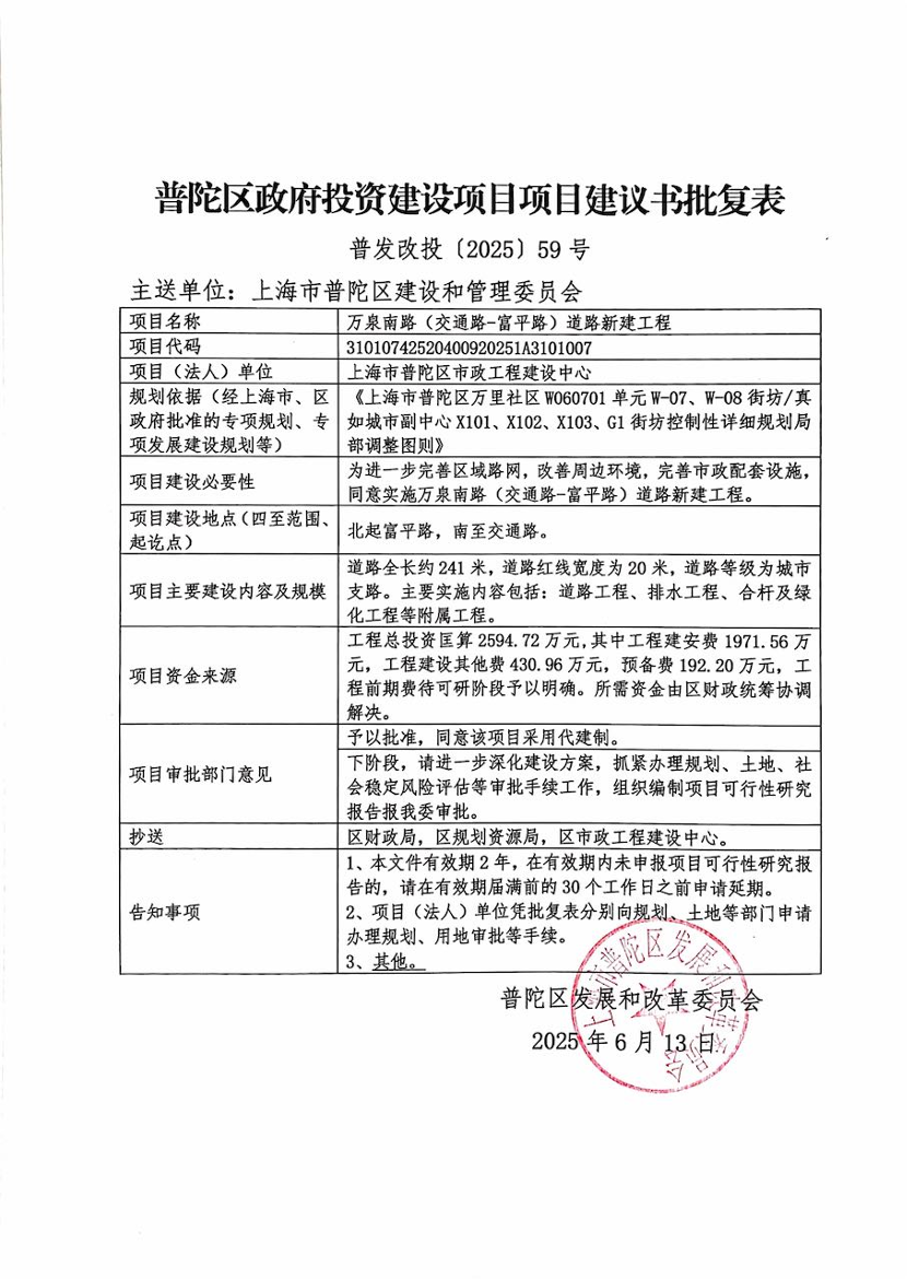 关于万泉南路(交通路-富平路)道路新建工程项目建议书的批复
