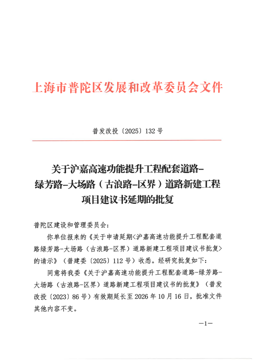 你单位报来的《关于申请延期<沪嘉高速功能提升工程配套道路绿芳路-大场路(古浪路-区界)道路新建工程项目建议书批复>的请示》(普建委〔2025〕112号)收悉。经研究批复如下:
