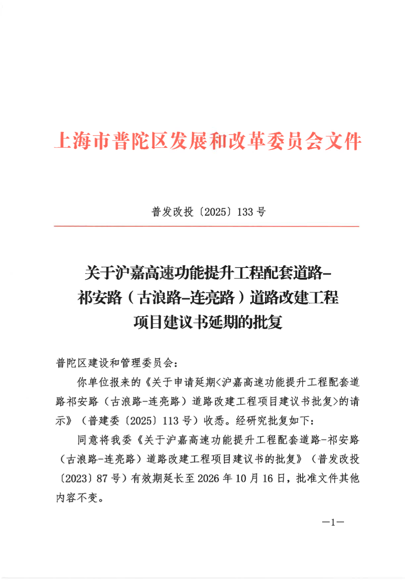 你单位报来的《关于申请延期<沪嘉高速功能提升工程配套道路祁安路(古浪路-连亮路)道路改建工程项目建议书批复>的请示》(普建委〔2025〕113号)收悉。经研究批复如下: