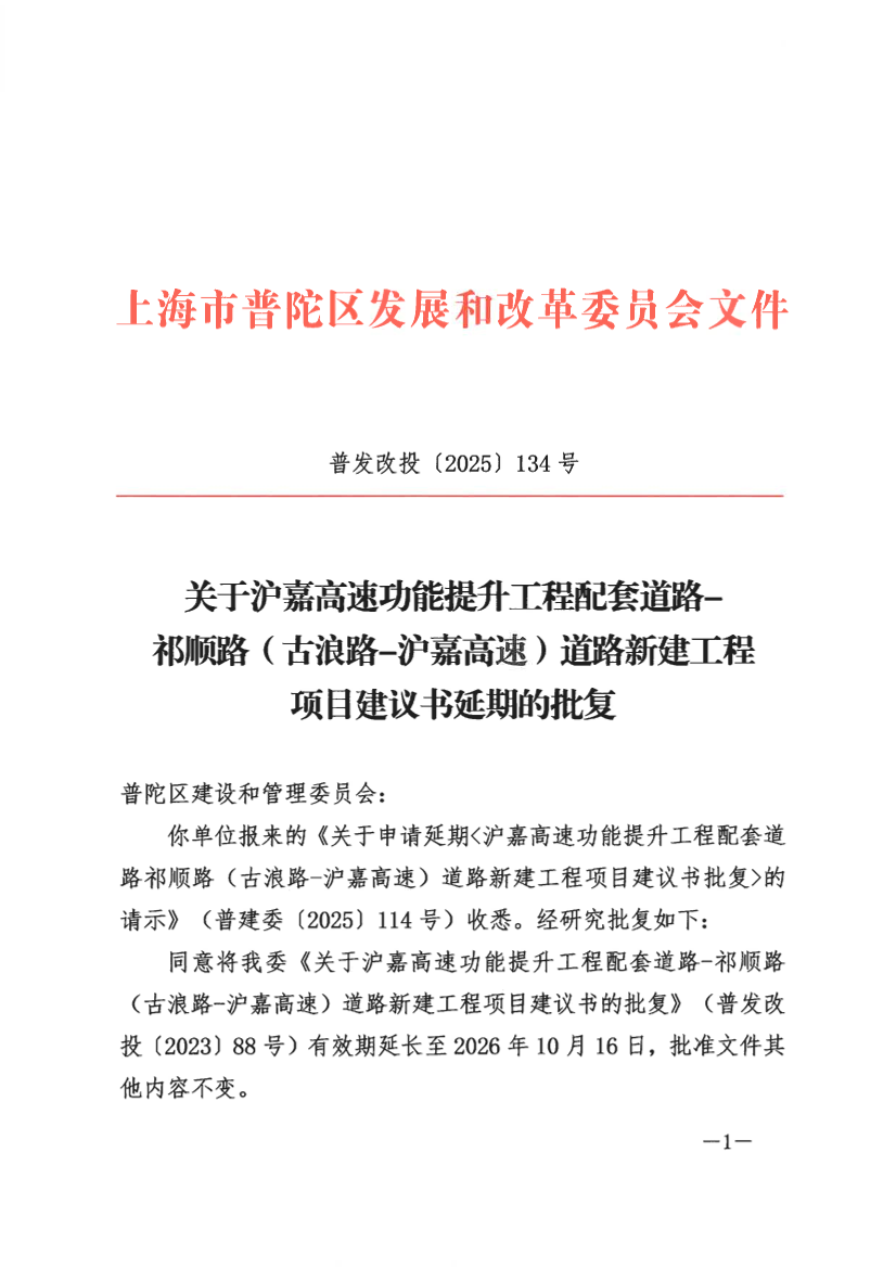 你单位报来的《关于申请延期<沪嘉高速功能提升工程配套道路祁顺路(古浪路-沪嘉高速)道路新建工程项目建议书批复>的请示》(普建委〔2025〕114号)收悉。经研究批复如下: