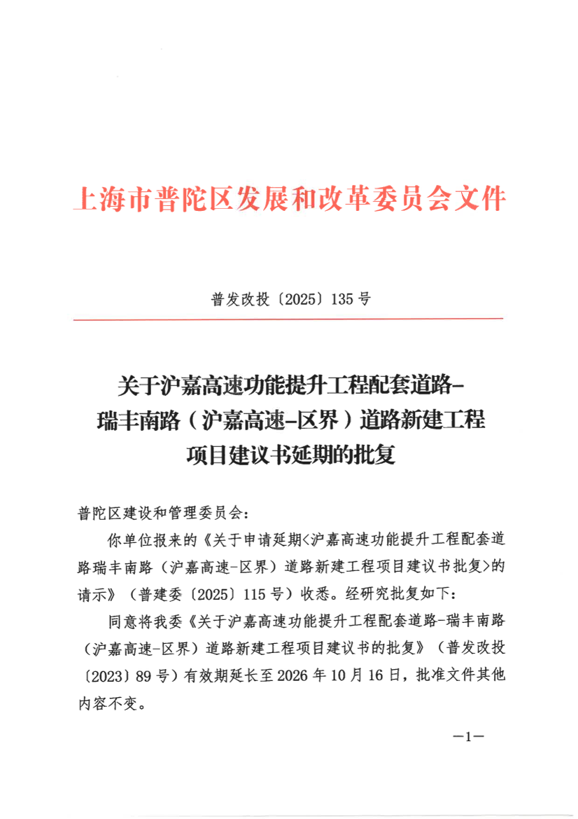 你单位报来的《关于申请延期<沪嘉高速功能提升工程配套道路瑞丰南路(沪嘉高速-区界)道路新建工程项目建议书批复>的请示》(普建委〔2025〕115号)收悉。经研究批复如下: