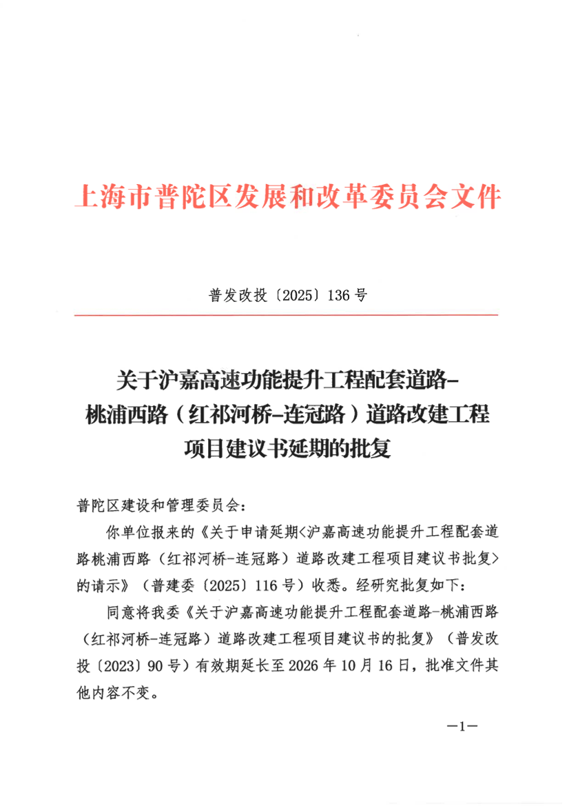 你单位报来的《关于申请延期<沪嘉高速功能提升工程配套道路桃浦西路(红祁河桥-连冠路)道路改建工程项目建议书批复>的请示》(普建委〔2025〕116号)收悉。经研究批复如下: