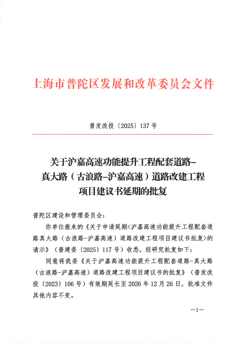 同意将我委《关于沪嘉高速功能提升工程配套道路-真大路(古浪路-沪嘉高速)道路改建工程项目建议书的批复》(普发改投〔2023〕106号)有效期延长至2026年12月26日,批准文件其他内容不变。