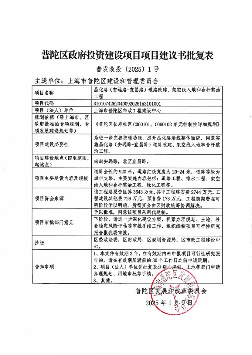 关于昌化路(安远路-宜昌路)道路改建、架空线和合杆整治工程建议书的批复