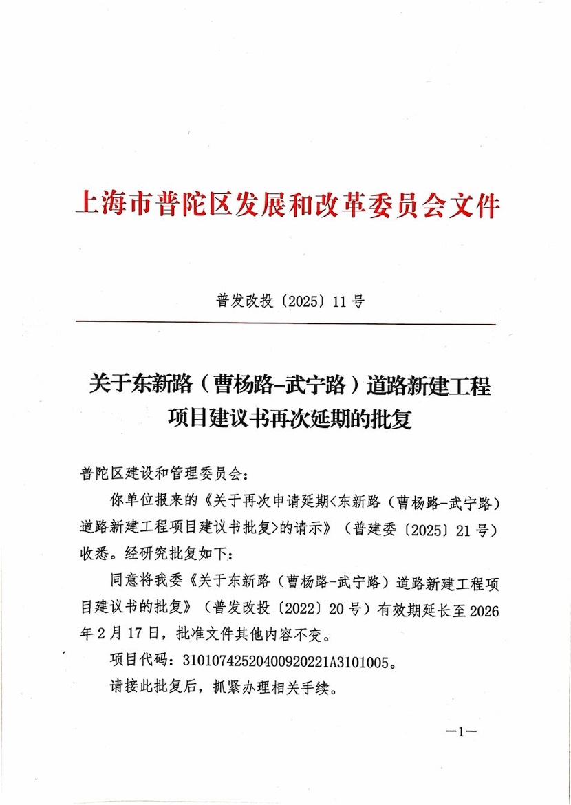你单位报来的《关于再次申请延期<东新路(曹杨路-武宁路)道路新建工程项目建议书批复>的请示》(普建委〔2025〕21号)收悉。经研究批复如下: