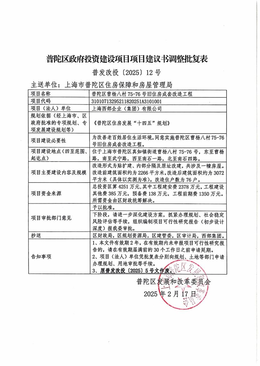 关于普陀区曹杨八村75-76号旧住房成套改造工程调整项目建议书的批复