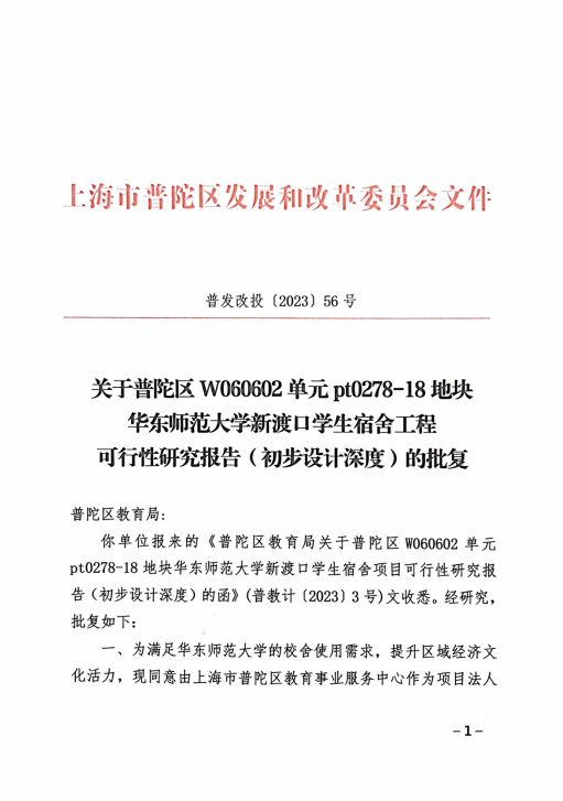 你单位报来的《普陀区教育局关于普陀区W060602单元pt0278-18地块华东师范大学新渡口学生宿舍项目可行性研究报告(初步设计深度)的函》(普教计〔2023〕3号)文收悉。经研究,批复如下: