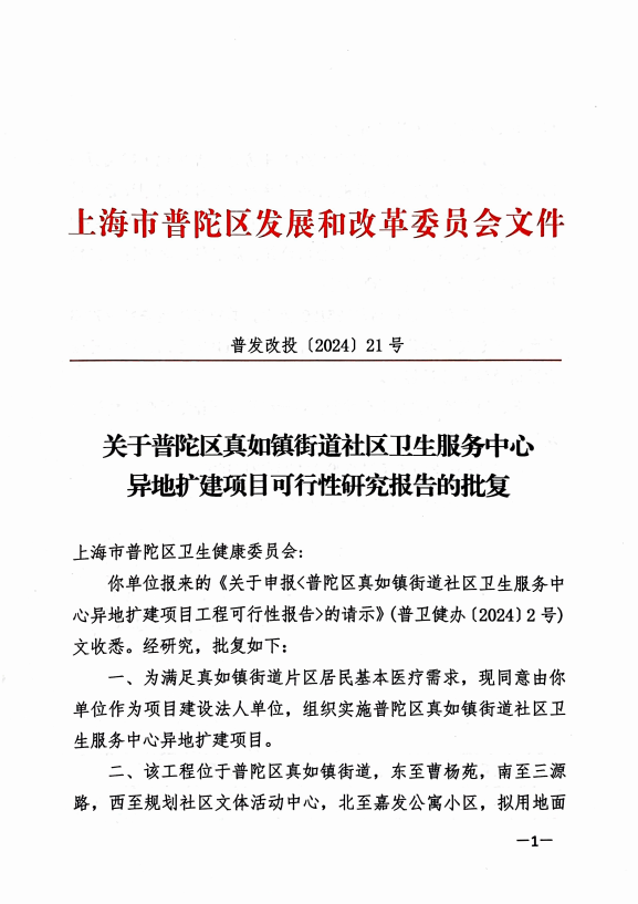 一、为满足真如镇街道片区居民基本医疗需求,现同意由你单位作为项目建设法人单位,组织实施普陀区真如镇街道社区卫生服务中心异地扩建项目。