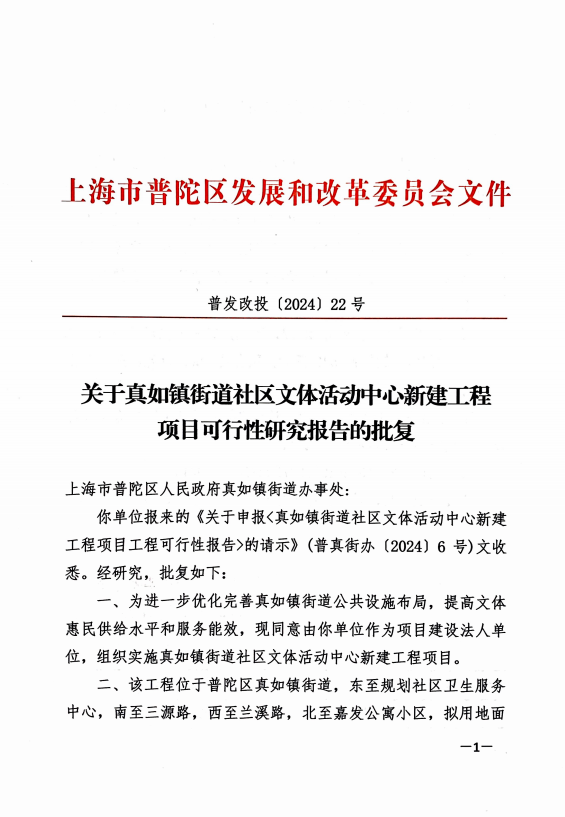 一、为进一步优化完善真如镇街道公共设施布局,提高文体惠民供给水平和服务能效,现同意由你单位作为项目建设法人单位,组织实施真如镇街道社区文体活动中心新建工程项目。