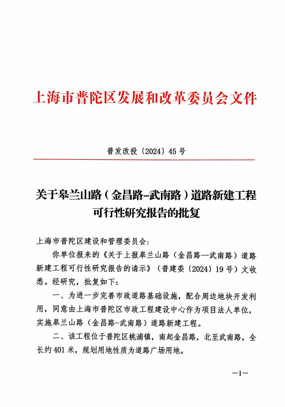 一、为进一步完善市政道路基础设施,配合周边地块开发利用,同意由上海市普陀区市政工程建设中心作为项目法人单位,实施皋兰山路(金昌路-武南路)道路新建工程。