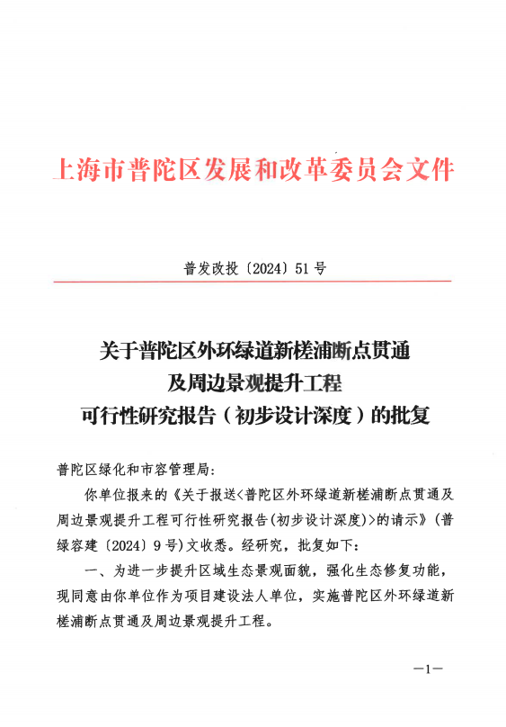一、为进一步提升区域生态景观面貌,强化生态修复功能,现同意由你单位作为项目建设法人单位,实施普陀区外环绿道新槎浦断点贯通及周边景观提升工程。