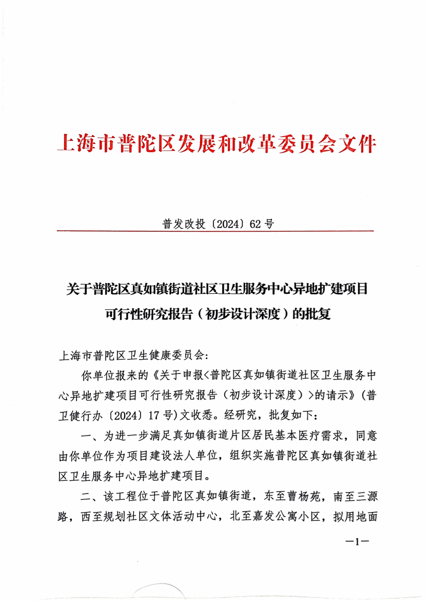 一、为进一步满足真如镇街道片区居民基本医疗需求,同意由你单位作为项目建设法人单位,组织实施普陀区真如镇街道社区卫生服务中心异地扩建项目。