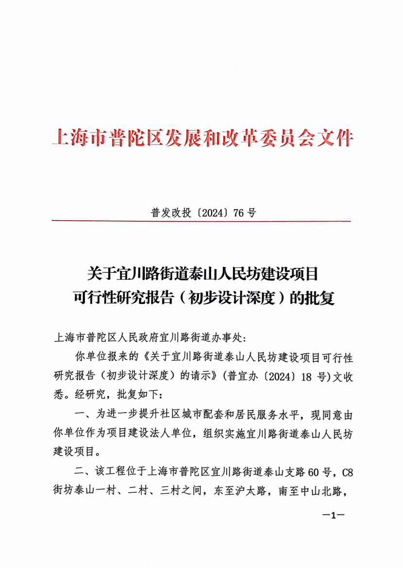 你单位报来的《关于宜川路街道泰山人民坊建设项目可行性研究报告(初步设计深度)的请示》(普宜办〔2024〕18号)文收悉。经研究,批复如下: