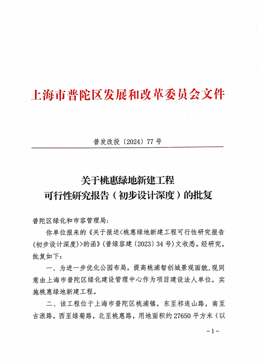 一、为进一步优化公园布局,提高桃浦智创城景观面貌,现同意由上海市普陀区绿化建设管理中心作为项目建设法人单位,实施桃惠绿地新建工程。