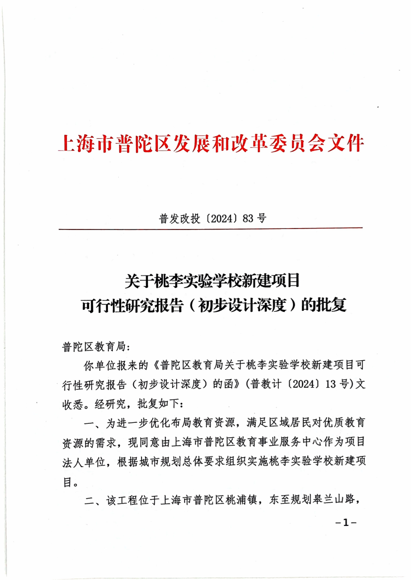 你单位报来的《普陀区教育局关于桃李实验学校新建项目可行性研究报告(初步设计深度)的函》(普教计〔2024〕13号)文收悉。经研究,批复如下: