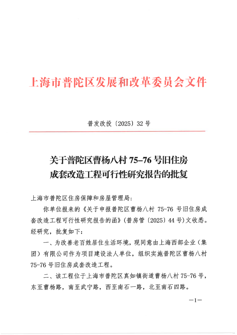 你单位报来的《关于申报普陀区曹杨八村75-76号旧住房成套改造工程可行性研究报告的函》(普房管〔2025〕44号)文收悉。经研究,批复如下: