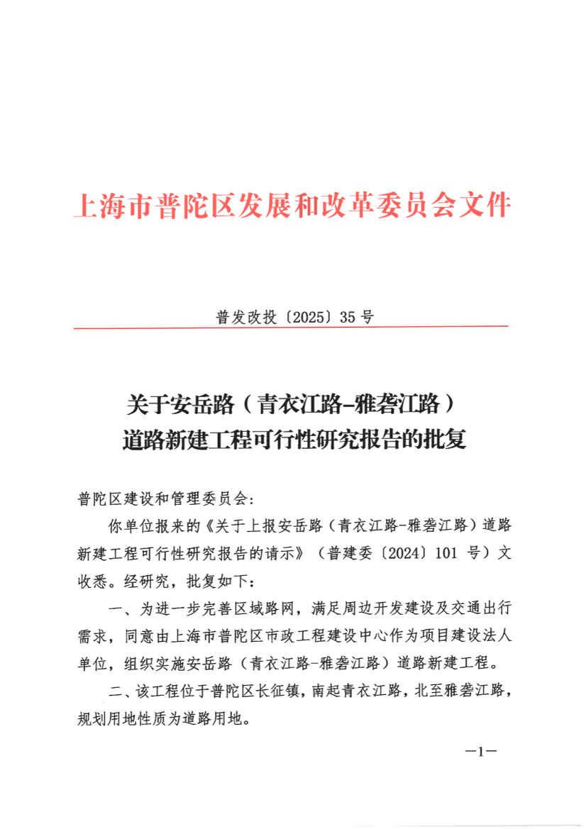 一、为进一步完善区域路网,满足周边开发建设及交通出行需求,同意由上海市普陀区市政工程建设中心作为项目建设法人单位,组织实施安岳路(青衣江路-雅砻江路)道路新建工程。