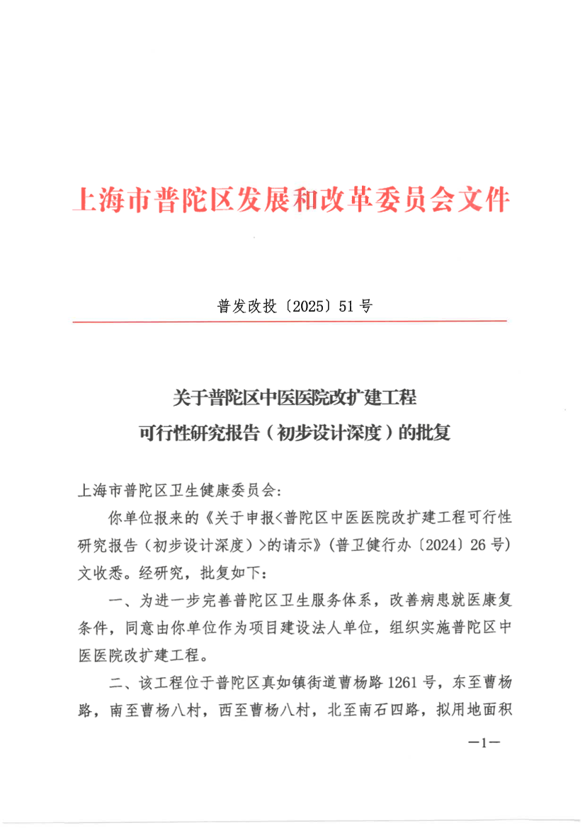 你单位报来的《关于申报<普陀区中医医院改扩建工程可行性研究报告(初步设计深度)>的请示》(普卫健行办〔2024〕26号)文收悉。经研究,批复如下: