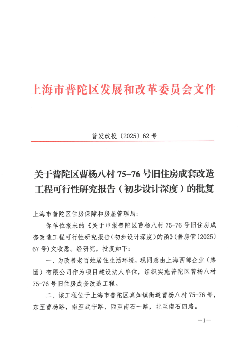 一、为改善老百姓居住生活环境,现同意由上海西部企业(集团)有限公司作为项目建设法人单位,组织实施普陀区曹杨八村75-76号旧住房成套改造工程。