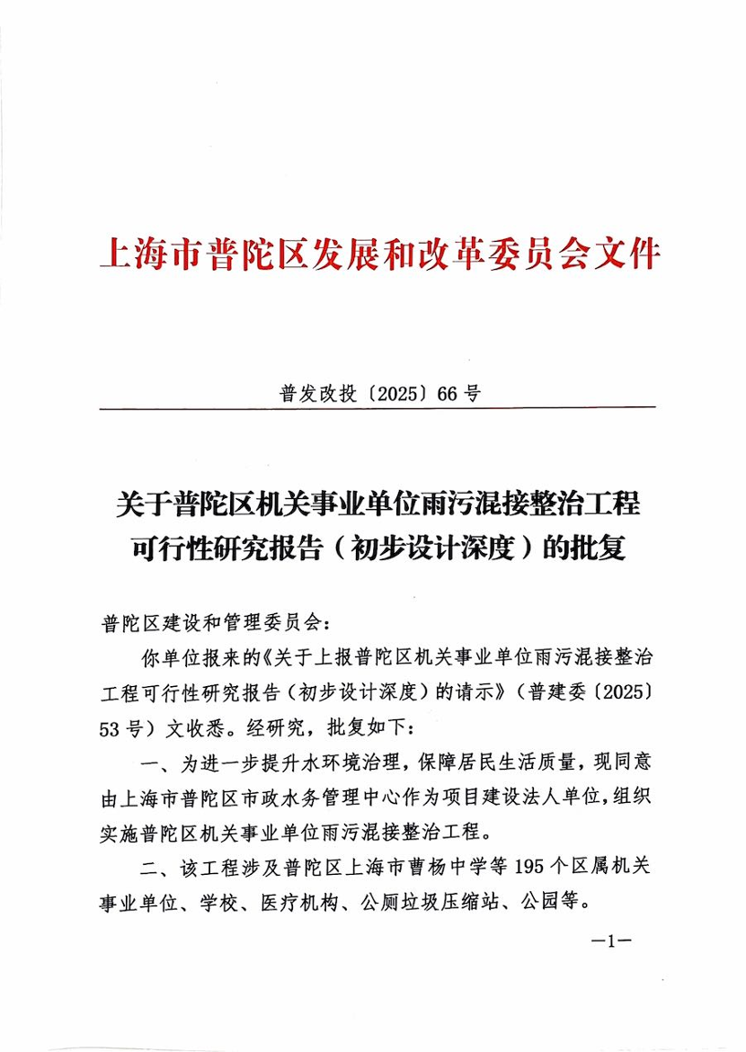 你单位报来的《关于上报普陀区机关事业单位雨污混接整治工程可行性研究报告(初步设计深度)的请示》(普建委〔2025〕53号)文收悉。经研究,批复如下: