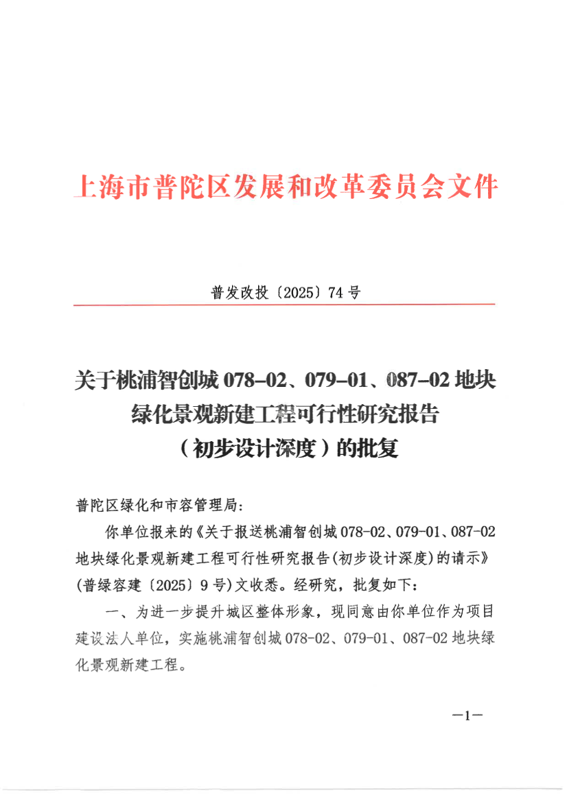 你单位报来的《关于报送桃浦智创城078-02、079-01、087-02地块绿化景观新建工程可行性研究报告(初步设计深度)的请示》(普绿容建〔2025〕9号)文收悉。经研究,批复如下: