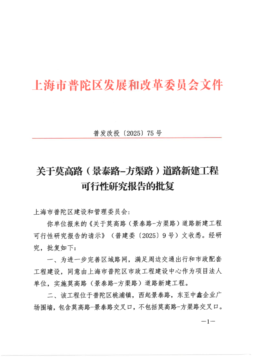 一、为进一步完善区域路网,满足周边交通出行和市政配套工程建设,同意由上海市普陀区市政工程建设中心作为项目法人单位,实施莫高路(景泰路-方渠路)道路新建工程。