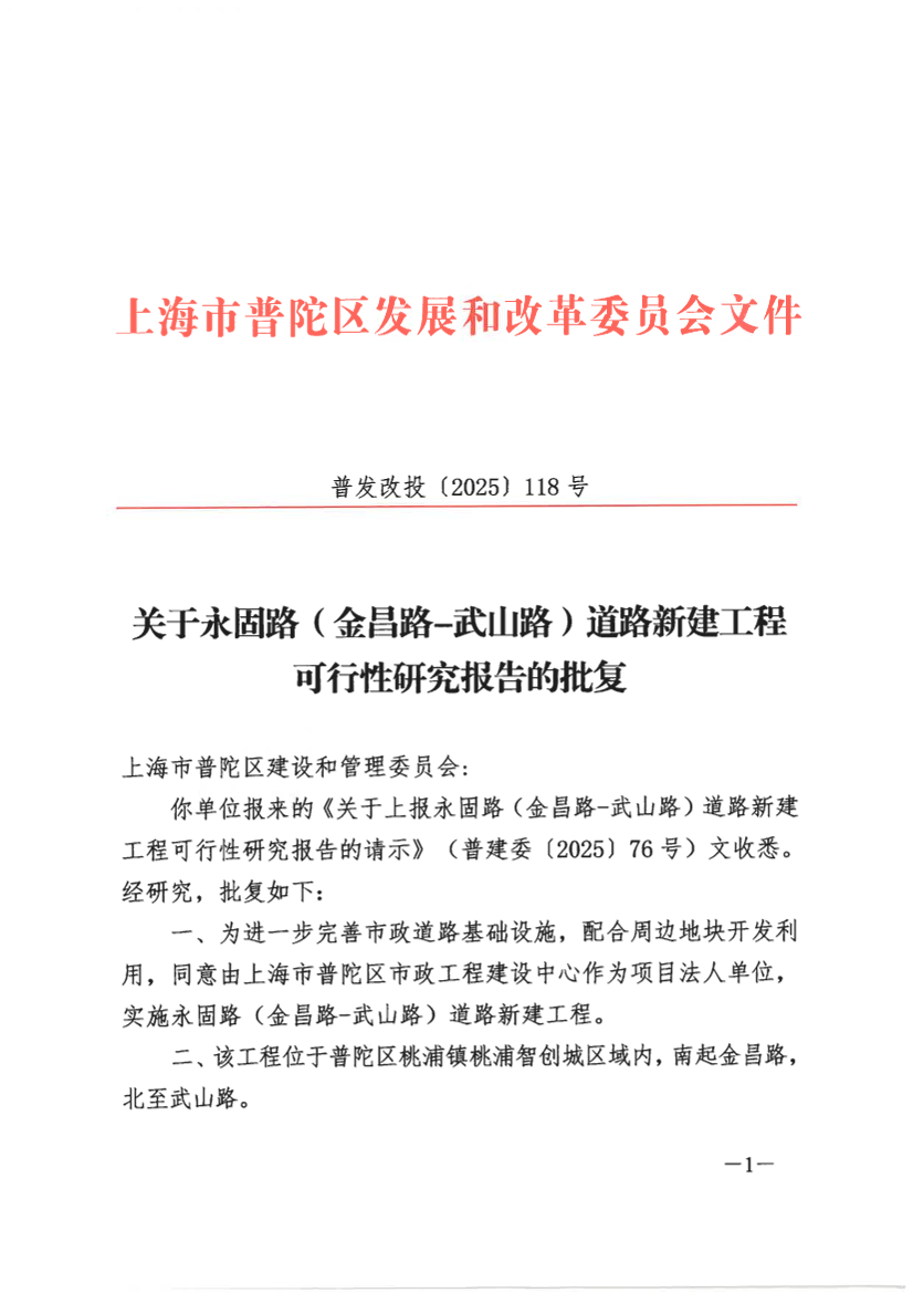 你单位报来的《关于上报永固路(金昌路-武山路)道路新建工程可行性研究报告的请示》(普建委〔2025〕76号)文收悉。经研究,批复如下: