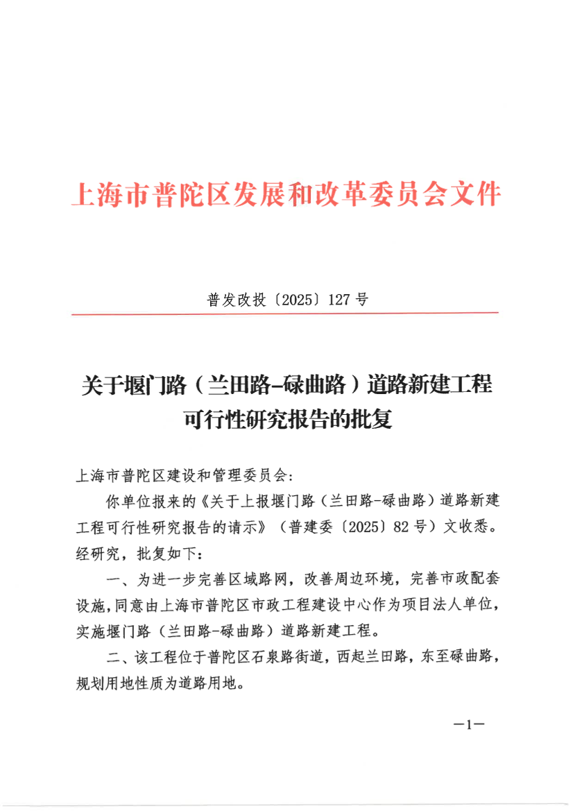 一、为进一步完善区域路网,改善周边环境,完善市政配套设施,同意由上海市普陀区市政工程建设中心作为项目法人单位,实施堰门路(兰田路-碌曲路)道路新建工程。