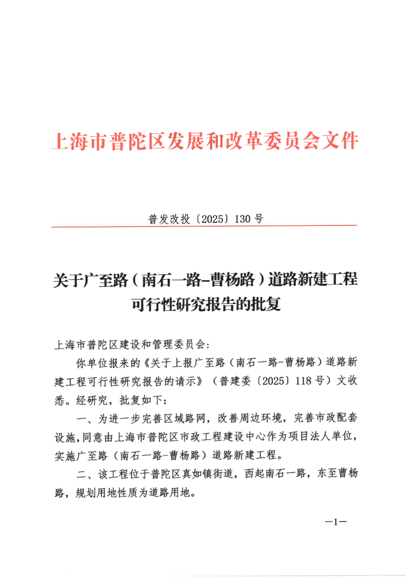 你单位报来的《关于上报广至路(南石一路-曹杨路)道路新建工程可行性研究报告的请示》(普建委〔2025〕118号)文收悉。经研究,批复如下: