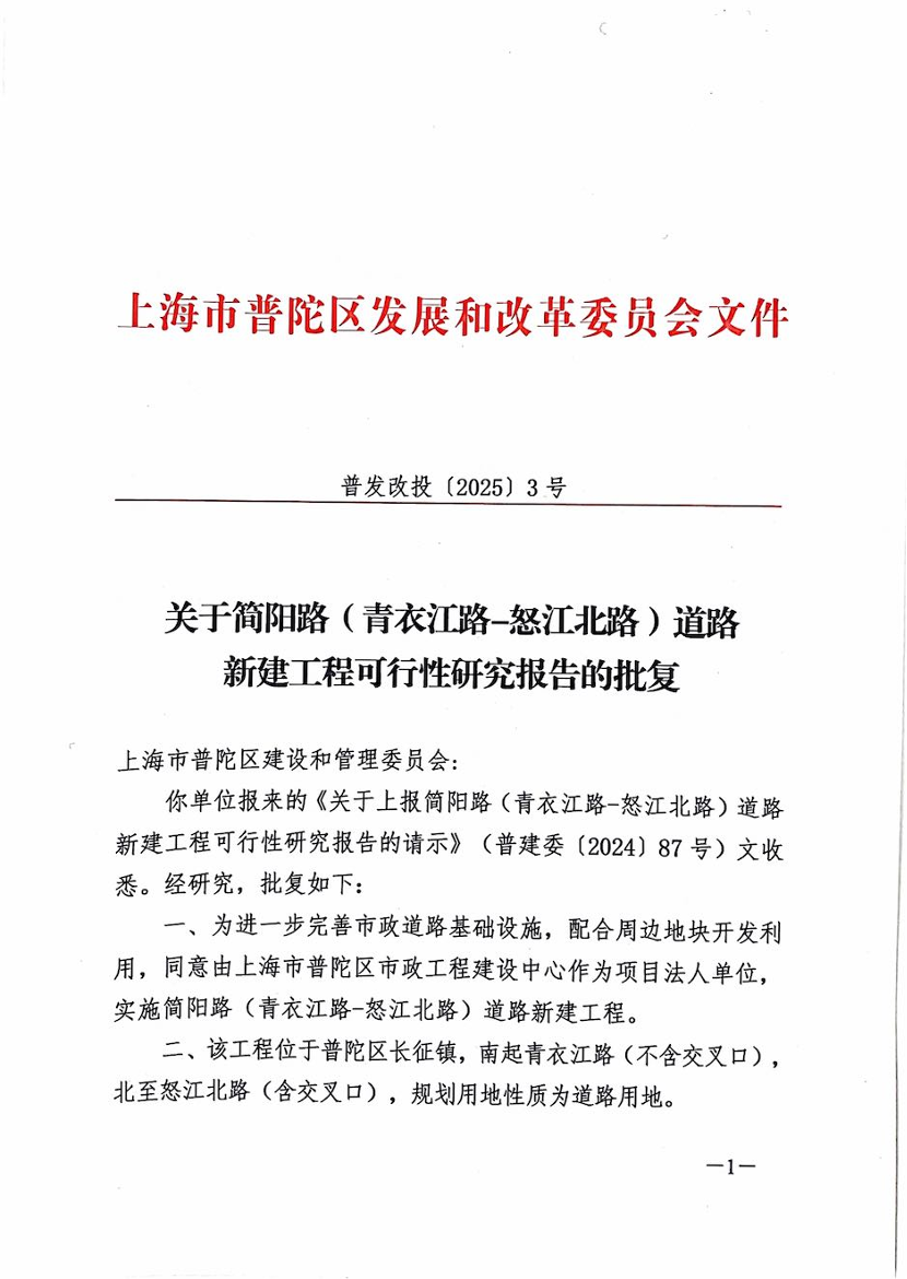 你单位报来的《关于上报简阳路(青衣江路-怒江北路)道路新建工程可行性研究报告的请示》(普建委〔2024〕87号)文收悉。经研究,批复如下: