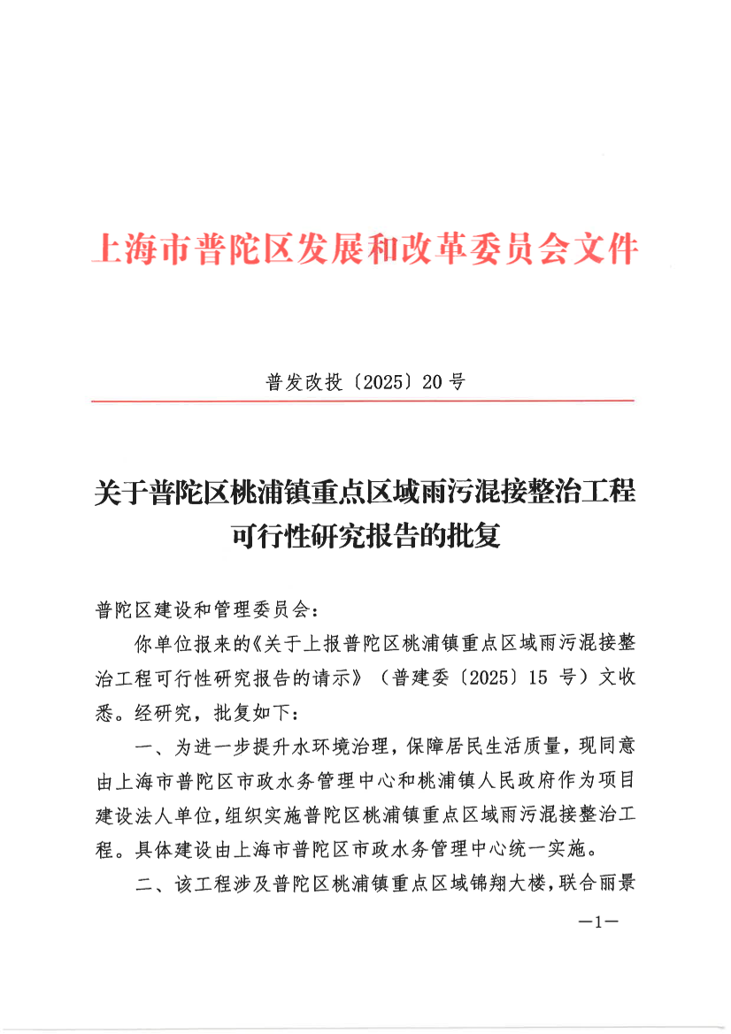 你单位报来的《关于上报普陀区桃浦镇重点区域雨污混接整治工程可行性研究报告的请示》(普建委〔2025〕15号)文收悉。经研究,批复如下:
