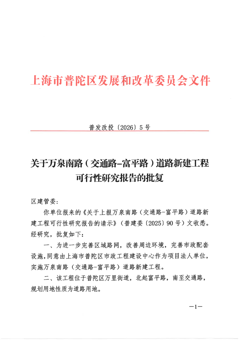 一、为进一步完善区域路网,改善周边环境,完善市政配套设施,同意由上海市普陀区市政工程建设中心作为项目法人单位,实施万泉南路(交通路-富平路)道路新建工程。