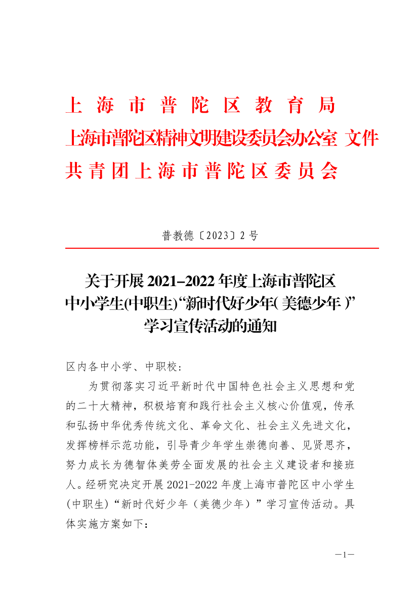 关于开展2021-2022年度上海市普陀区中小学生(中职生)“新时代好少年(美德少年)”学习宣传活动的通知