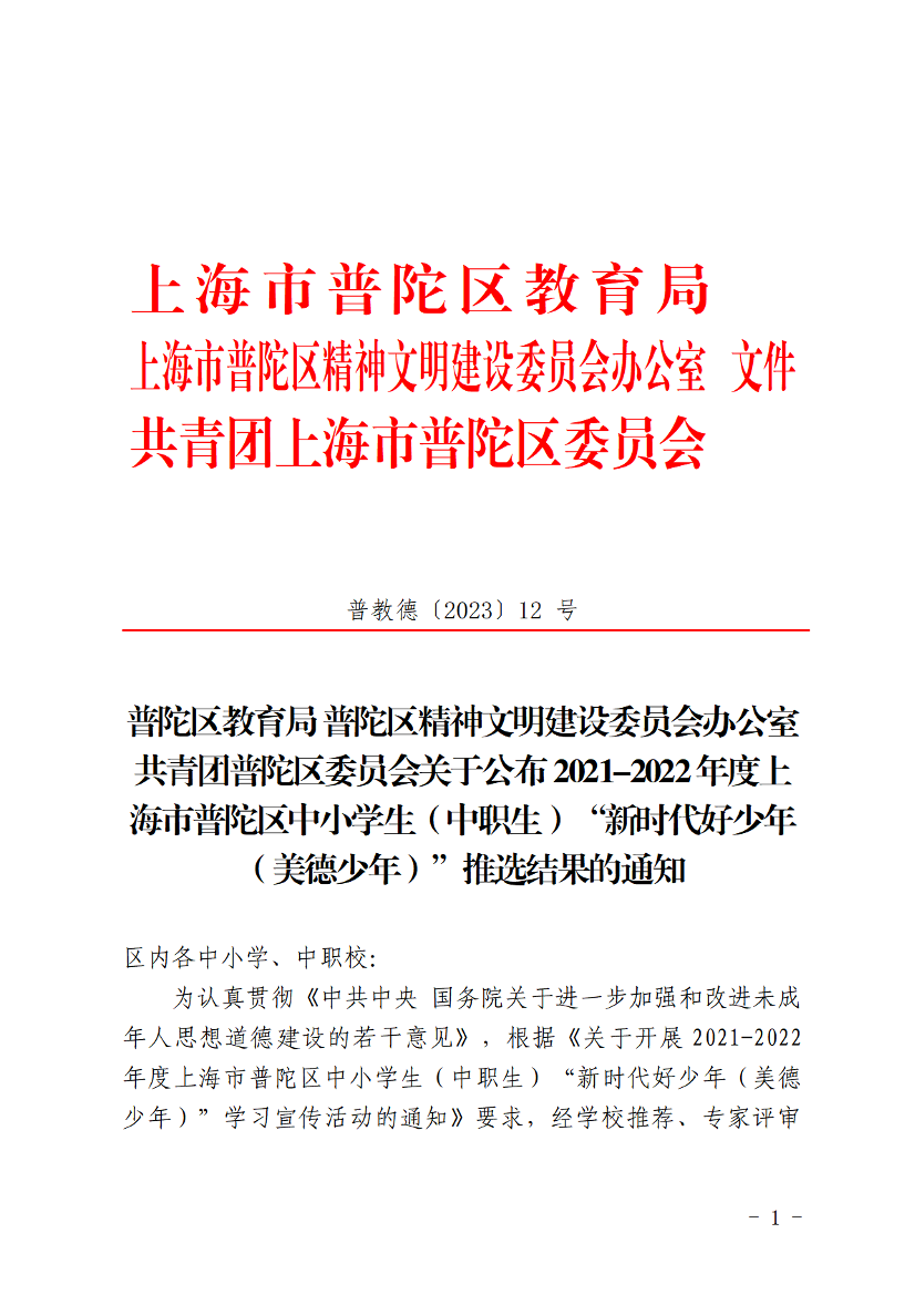 关于公布2021-2022年度上海市普陀区中小学生(中职生)“新时代好少年(美德少年)”推选结果的通知