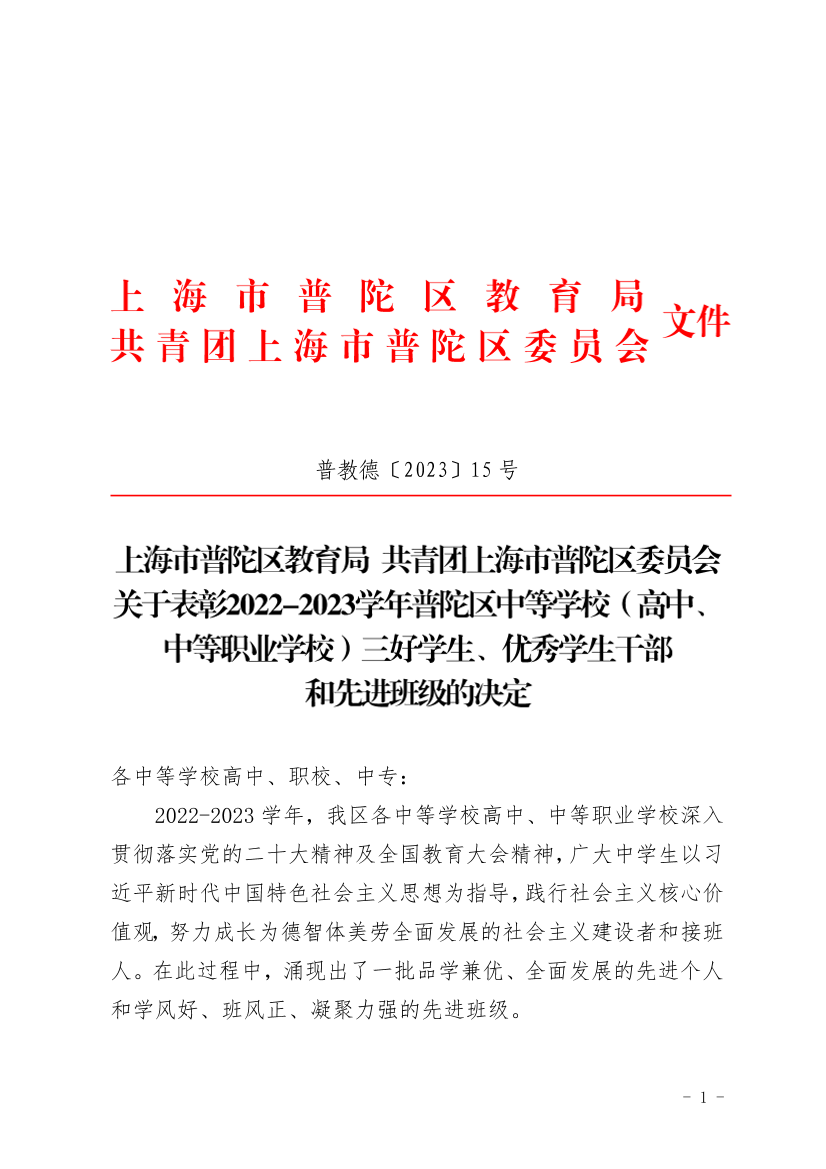 关于表彰2022-2023学年普陀区中等学校(高中、中等职业学校)三好学生、优秀学生干部和先进班级的决定